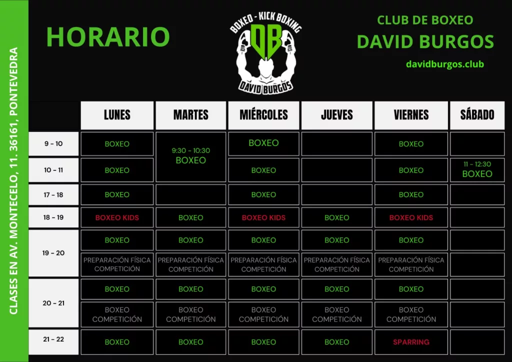 Horario para nuestras clases de boxeo en Pontevedra, impartidas en Av. Montecelo, 11, 36161 Pontevedra. Consulta con nosotros para más información.